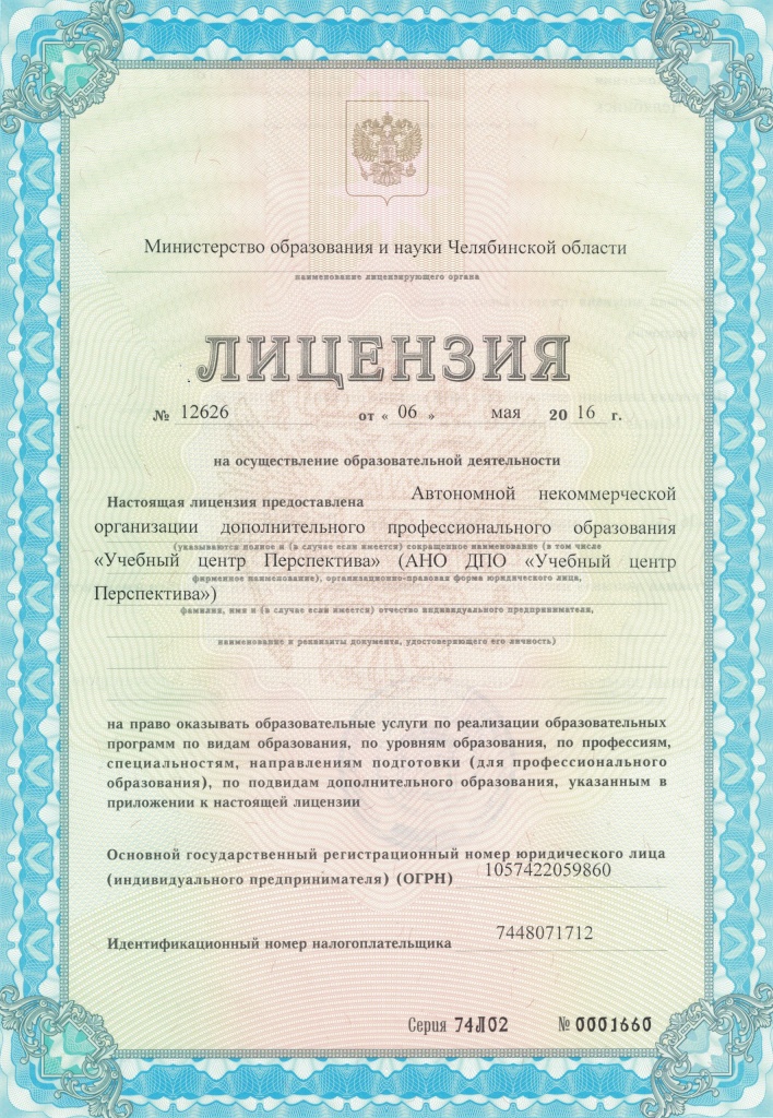 • Лицензия на осуществление образовательной деятельности №12626 от 16 мая 2016г.
